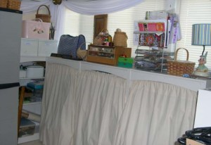 My fabrics are behind the curtains to keep them from light fading. I have north light in this 14 ft. wall of windows which is really nice when working on the design wall on the opposite side of the room. The cabinet has all my ‘wet’ supplies such as dyes, paints, brushes, tubs, etc. There really doesn’t seem to be enough space….ever….but then I force myself to edit and purge. I keep two different kinds of fabrics here: art quilt supplies and traditional supplies. I try to do one charity quilt each month for my guild. I’m behind right now but have those packed to finish in Texas.