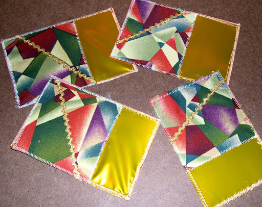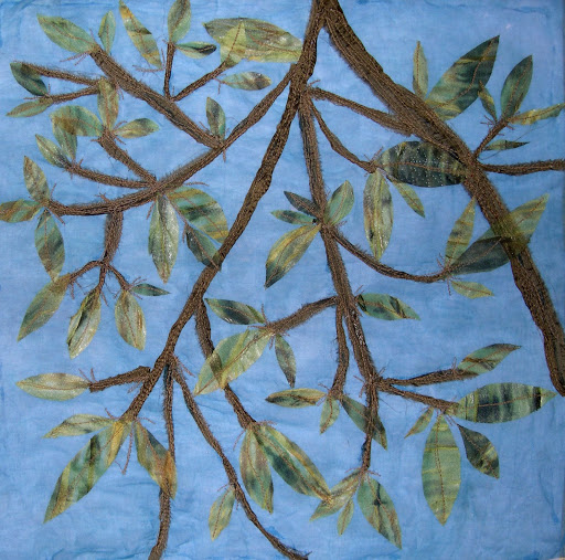 The leaves postcards were a 16 inch square of recycled blue silk that I used for the background of these leaf postcards. The stems and the leaves are also cut from recycled silk scarves. I really like the way these turned out.