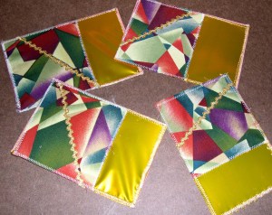 The funky ones shown last were for an anything goes theme. The background is taupe ultrasuede. The orange square is cut from some silk screened and painted fabric. They have gold metallic paint splotches to jazz them up a bit.