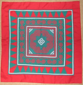I think this is actually a P'an d'au, the Hmong work rather than a mola. Both use reverse applique, but this one looks more like the Cambodian work than the molas that I have from the San Blas islands.
