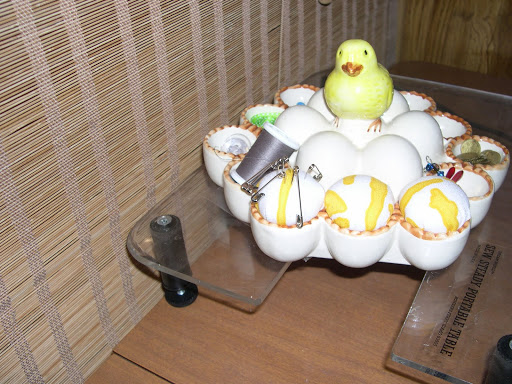 Here is my little egg holder all gussied up to use. Some of you asked for a finished picture. It’s so handy since I don’t have a drawer in my sewing table and I am notorious for saving little bits and pieces. The bright green is a wonderful snippet of ribbon that was tied around our plate of cookies we brought home from the cookie exchange…ymmmm….the little coins are from a scarf I bought at a local Ropa. This was a scarf for a belly dancer I’m sure and it was ringed with over 50 small thin coins stamped with eastern symbols.
