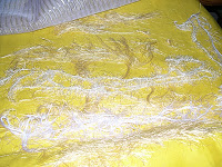 I wanted a hand dyed look for the piece I’m working on. I don’t have any dye here and my textile paints are buried somewhere right now in the closet area that still has to be painted. So I decided to build my colors using loose threads and fun yarns. I thought they might yield some interesting results since the fringes would tend to bleed into the next layer. I started with bright yellow cotton and layered different white and ecru fibers. Then I started adding colors. Just like dyes, I had to consider the juxtaposition of color to get the look I wanted. Maybe not as serendipitous as dyeing, but it yielded some good results.