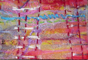 Here is one of the ATC’s [ artist trading card] that is made from the trimmed edges of the piece I am working on. The theme for this trade was The Color Red so I also backed it with red watercolor paper. I pretty much love the way this turned out. I hope the recipients love it,too and I can’t wait to see the cards I get in return. I will post them when they come.