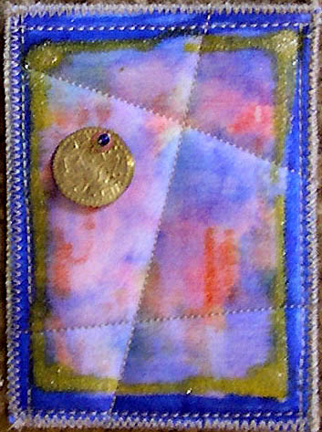 This ATC swap is our current one. Wanda came up with our theme of “Warped”, to be interpreted however you chose. I went with the creating a warp and then weaving silver toothpicks in the weft. The medallion is another of my finds from a ropa mercado. It was an elastic belt that I tore apart to yield dozens of these pewter medallions. I will put these in the mail this week after I make little bubble wrap envelopes for them.