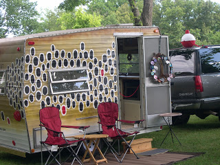 This trailer is painted like a brown trout. The tow vehicle is in front of it. Notice the very large red and white bobber on the top. As we sent around to the front we saw the line coming from the antenae to the bobber and then this wonderful peacock feather  fly  that had hooked to the window! I love the creativity of this sister, all the detail she put into the trailer.