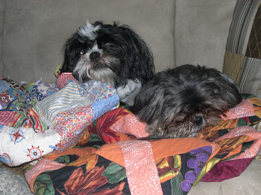 I don't think that my dogs or cats have caused anymore–and maybe less–wear and tear than if a kid was using my quilts and my two dogs are 100 pounds each. They are my quilting buddies.