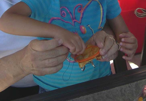 We started with one color that she chose to use. Then when she discovered that grandma had lots of colors in the case she was ready to switch colors after every stitch. Of course, using scissors to cut the threads was pretty fascinating for her, too.