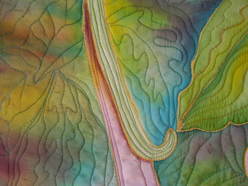 I’m taking a break from marathon quilting to post this. It is a close up shot of a painted wholecloth silk quilt titled “Angel Trumpet Splendor”. I love this quilt with all the varied colors created from the silk paint. It doesn’t hurt that the Angel Trumpet is one of my favorite plants.