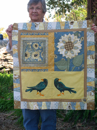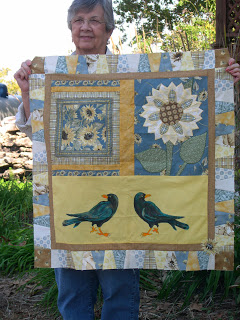 The crows in my Gel Glue tutorial were added to Barb’s quilt and then passed along to the last group member who had the task of adding something to it. That quilter chose this great coin border using many of the fabrics that were in Barb’s bag. Now Barb gets to either finish this as it is for a wall hanging or add to it for a larger quilt.