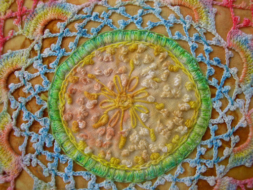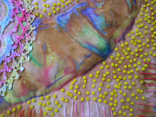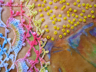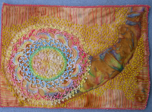 The shape came from a piece of rusted fabric. The amoebic form was highlighted with Inktense pencils. The crochet center was stitched down and accented with embroidery which was also highlighted with Inktense. I have no idea how many little seed beads are stitched down but I like to think they are all the ideas swirling in my head that have been set free. The long outside perimeter stitches use some of my hand dyed floss. Hope you like it!