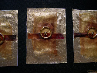 I used gold lame and two different golden ribbons on the background. The center golden pieces are the circle with a dot n the middle, the alchemist’s symbol for gold. This gave me a chance to tryout some of my powders I showed you in a previous post. They were wonderful! I used the brown powder and dusted it over the ribbons. It stuck the most where some of the fabric glue had come through but it still blended very nicely. I finished them off with a coating of workable fixative. As my way lately, I will leave the edges raw.