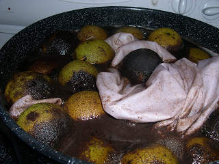 With all the talk about black walnuts on the Quiltart list I decided that since I live where they are plentiful that I would dye some cotton. Thanks to my DH who picked all these up on our last camping trip.