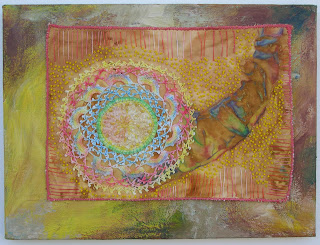 I posted this small piece when I finished the quilting earlier this year. I have been mounting some pieces on painted canvas. Using acrylics in the colors in each art quilt, I splash and blend the canvas. Then when the quilted piece is mounted, it all comes together into a mixed media piece, or assemblage art.