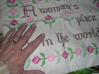 I adore vintage samplers. I’m not sure how vintage this one is but I LOVE it. It will be pressed and framed for my studio. The photo with my hand is for size reference.