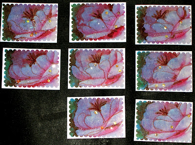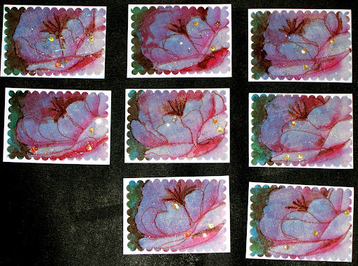 I layered the cloth image onto the rice paper and stitched around just enough of the petals to give the impression of the peonie and stamens. I used liquid water color to darken the leaves in the background and to darken the stamens. Each card is different and some have a blush of red to enhance the pink petals. The blues are from the photograph and are the morning shadows that contrast with the light petals in the foreground where the early light hit the petals. A small amount of glitter and 3 large drops of dew using glass sequins are on each card. The camera picked up the bottom layer of glitter, too.