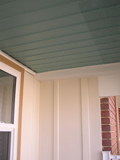 The porch floor is a dark olive green and the walls are a pale sand color. The trim is a dark sand, sort of the color of wet lake sand, not the white quartz sand you see on Gulf beaches. But one of the parts I like the best is the porch ceiling.