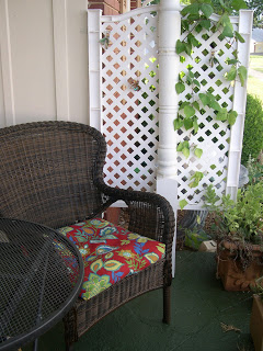 This is now our patio area with some high antique wrought iron planters to help screen us from prying eyes. Sorry, you can’t see them in this photo. I bought the happy outdoor fabric for the cushions in McAllen, TX.It makes me smile. The vine is a hyacinth purple bean that isn’t doing well in the heat but I’m hoping it will bloom when it cools down some. You can find some photos HERE You can tell this one has a long way to go so keep your fingers crossed for me.
