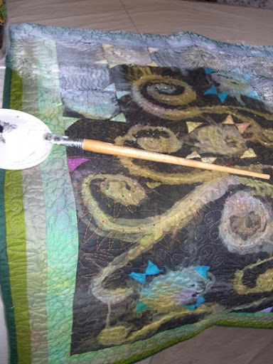 A couple of years ago I decided to use it as a practice piece for discharging and adding color back…yuck, it was a hot mess….then I started adding free motion quilting even though it was already hand quilted. When my friend Liz H. came last week to play for the day I pulled this piece out of storage and began covering it with white acrylic paint to add emphasis to the crinkles and quilted lines. Suddenly I started liking where it was going.