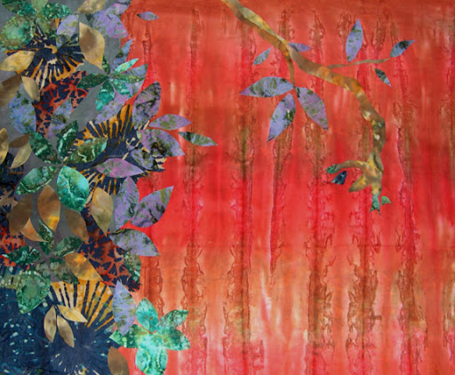 For this piece, rather than do a lot of surface design for a stucco wall, I found this piece of hand dyed in my stash that looks like rusty corrugated metal. Works for me!