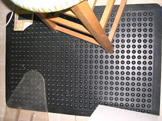 So far I have this machine sitting on top of my Koala cutting table. There isn’t a frame with the one I bought but they have a frame it will fit onto if that floats your boat. With the portable table you can see in the photos it is just the right height for standing to quilt. I can sit on a stool if I need to take a break, too. I bought a new cushy rubber mat at the home store. Each of these little bubbles squishes when you step on it. It feels wonderful and is a great surface to stand on without fatigue.