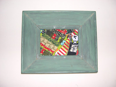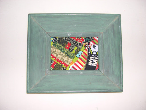 I had this heavy wooden frame that is just the right size so you can see what the piece will look like framed. The background is pieced and the skeleton is applied. He has wooden beads for ribs and eyes.