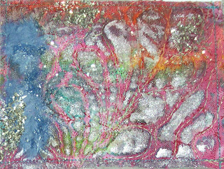 I attempted to capture that here. The cards began from a piece of randomly free motion quilted fabric left from another project. It was painted with textile paints and then highlighted with a lavender/silver pigment. I then randomly embellished with clear glass glitter and silver mirror glitter. Just like frosty windows, no two cards are alike.