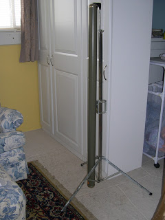 Then this week I found the one I wanted to try for $3. We tested it to make sure all the springs and adjustments worked before we bought it. The beauty of this is that it is very compact by itself as you can see in the first photo. The photo on the right shows the screen folded up with the flannel clipped on the top rail. It is still compact but simply unclip it and fold the flannel up if you want.