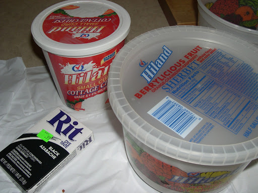 NO, this isn’t a what’s for dinner post. Although, this is my most favorite sherbet and brand of cottage cheese. We save these containers for use to store Beneful for the pups in small quantities that are easy to take along if we go on a trip. But they also get confiscated for use in the studio, too. The box of Rit dye is Black. A local store had a basket of black Rit marked for less than $1 so I stocked up. Black is such a hard color to dye. MX dyes can be cantankerous so I figured what did I have to loose by trying these out.