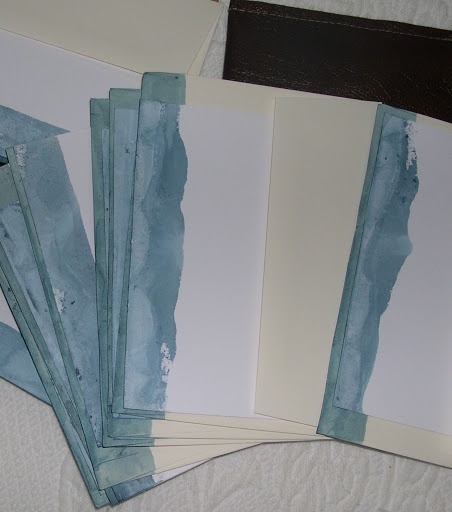 As Liz and I finally got to do our indigo vat, I got into my envelope and heavy card stock to make up blank card sets. I dipped one edge of both the card and the envelopes in the dye. They do look masculine don’t they? I have a stash of nice leather samples from a furniture store. As luck would have it when I folded them over and stitched up the sides they were just the right size for a case for the cards. I tied them up with a heavy round black elastic band for a closure. Now all I need to do is buy them each a pen for the set and they are ready to give. I’m linking with Nina Marie’s Off The Wall Friday