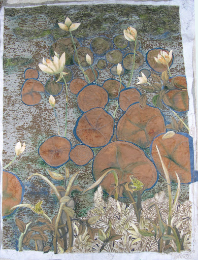 The basting glue had turned rock hard and couldn’t be sewn through. I soaked it in a tub which helped a lot. I was finally able to quilt the piece on my mid-arm. I simply quilted around all the elements that had to be removed. I then replaced all the lilies with rust dyed fabric. As I searched my stash I found the fabric I used for the long grasses and leaves. I heated the old stiff appliques and found the corresponding area on the fabric. Using a white lead pencil I drew around the area I needed to cut out and applied light weight fusible. This made it easy to replace the areas within the quilting outlines.
