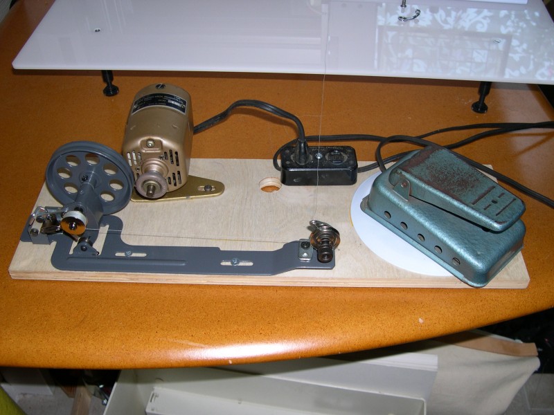 This was one of those times. It looked to me like it was simply a motor and foot control with that odd looking thingy for the bobbin to wind on. I have a vintage White machine I keep for parts…one of my 90 year old father’s cast offs. I stripped off the motor and motor mount, along with the electrical set up. Then a search on Ebay for industrial machine bobbin winders came up with the thingy for a total of $15 with shipping. !!!! A little measuring for placement and screwing it to the board and Ta-DAAA! It may not be pretty and I can add some paint later but it does the job wonderfully.