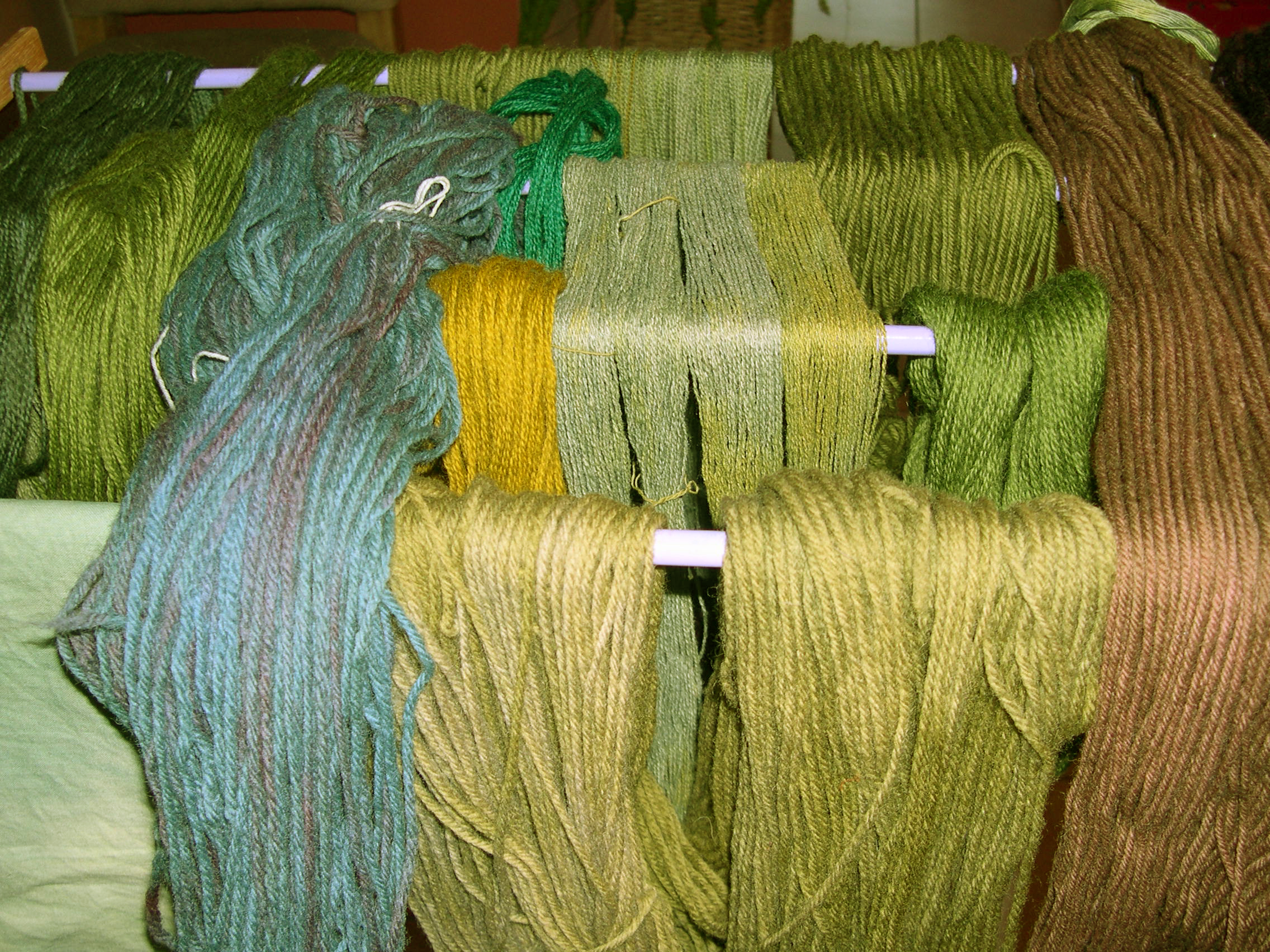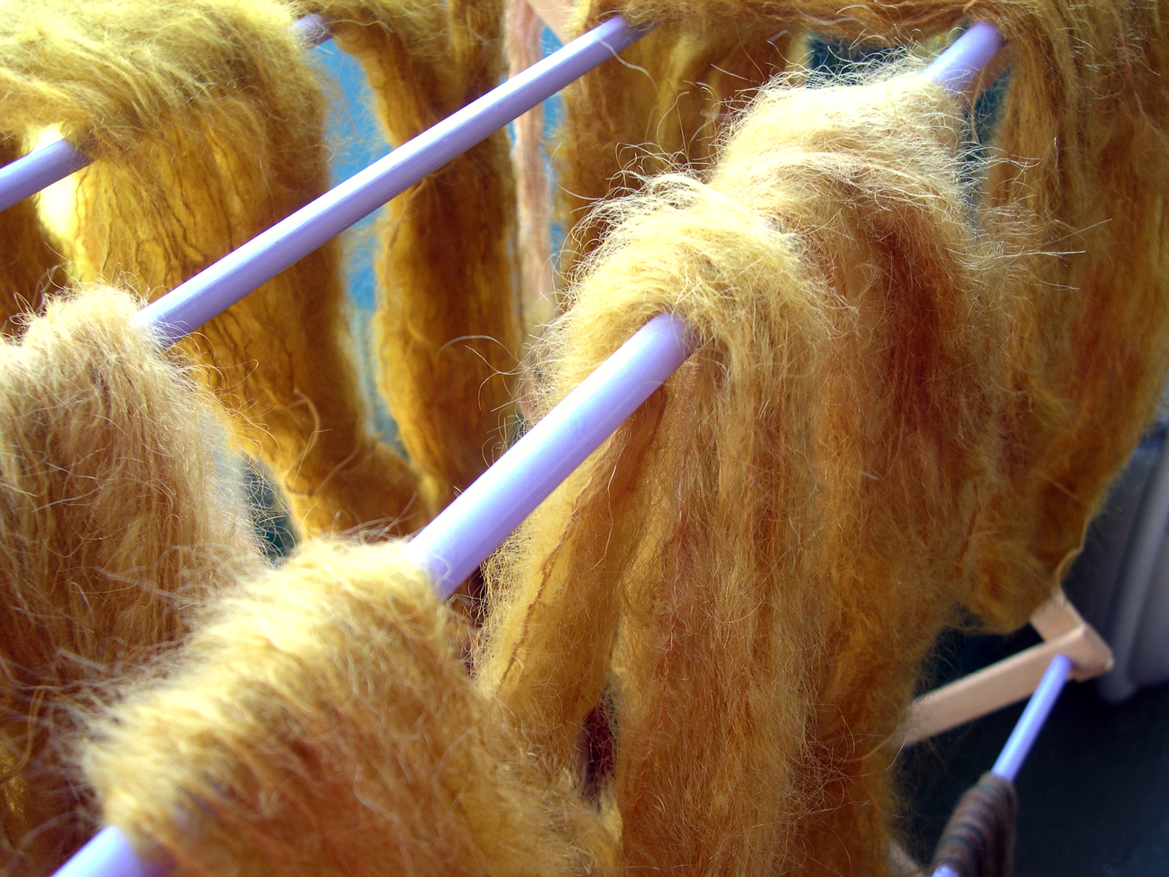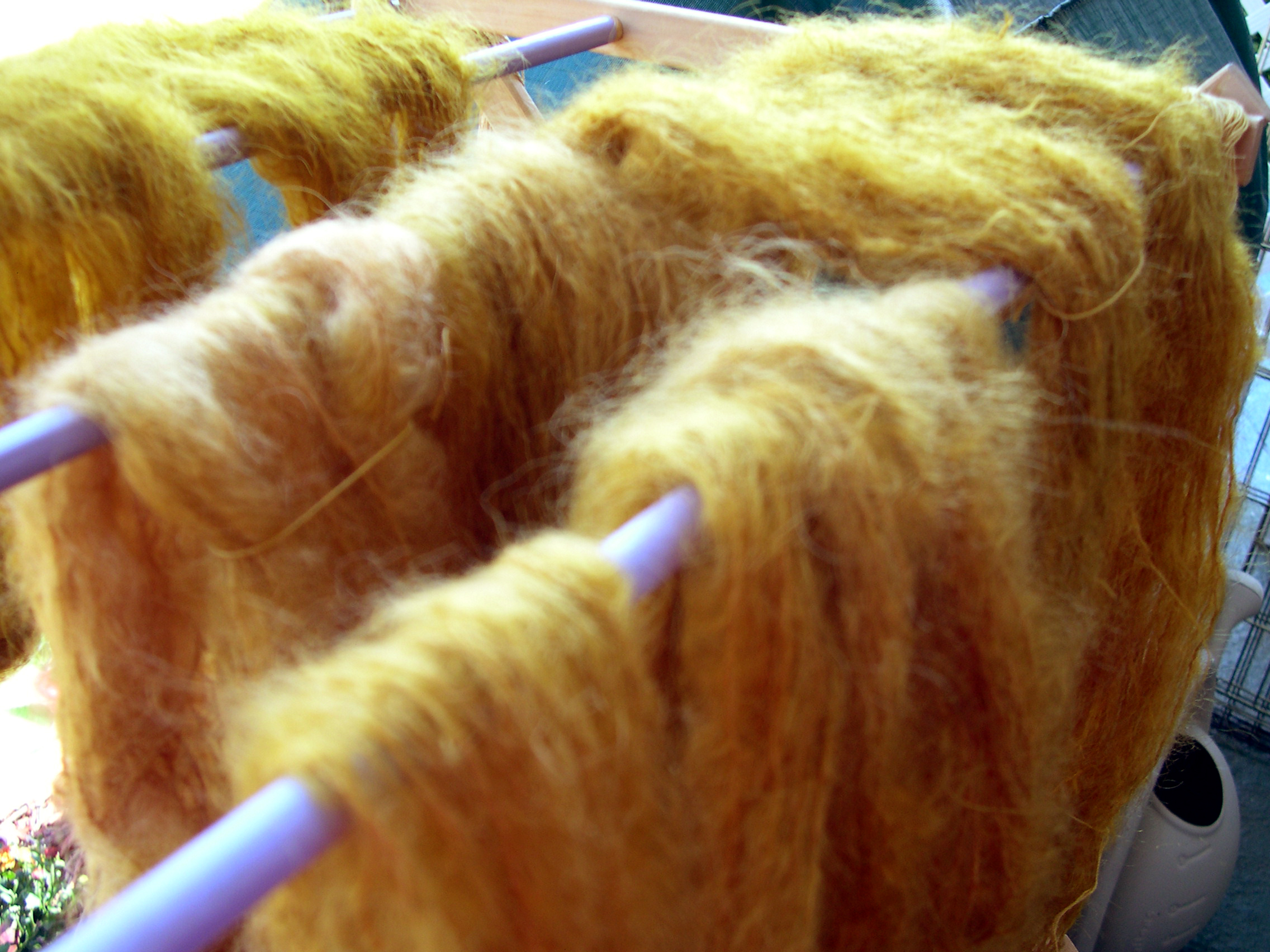 Wool dyeing Days October 14, 2013 | JP Dawes Artist Italian Mohair Salvaged from the critters 9 skeins of 40 grams in the dye pot and drying on the rack Overdyed commercial wools all in the same olive colored dye pot. Share this: Click to share on Pinterest (Opens in new window) Pinterest Click to share on X (Opens in new window) X Click to share on Facebook (Opens in new window) Facebook Click to email a link to a friend (Opens in new window) Email Click to share on LinkedIn (Opens in new window) LinkedIn Like Loading... Related