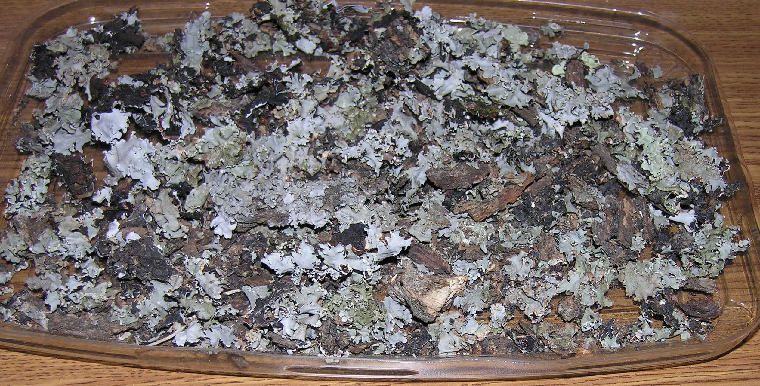 This is a tray of lichen we gathered on our walk the other day. After it is dry, I will crush it to extract the dye.