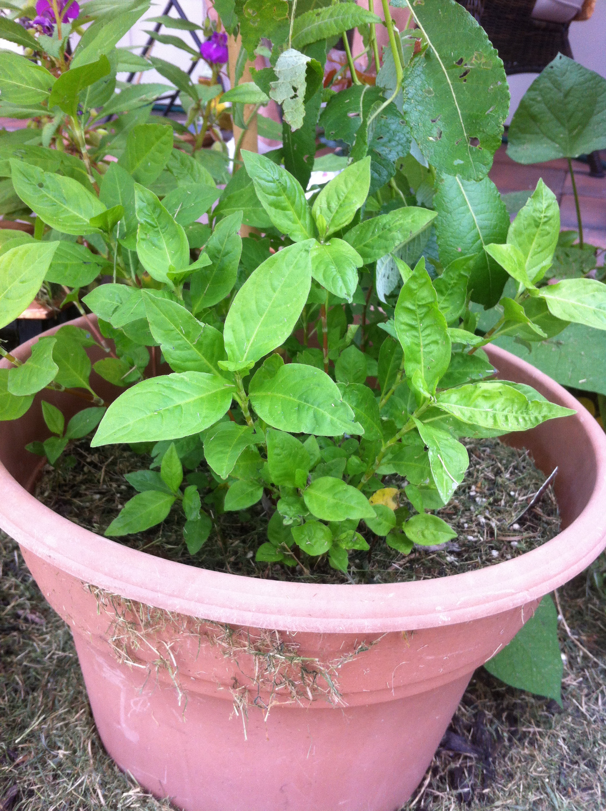 My Japanese indigo plants are doing great. An online friend shared seeds she gathered from John Marshall’s indigo garden. The pot is living under my weeping pussywillow tree. It gets filtered sun and it looks pretty happy!