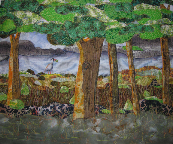 So the first thing I learned is that even with making a basic pattern , no two art quilts will ever be the same. They are the same but different. The middle tree is fatter and the heron is fatter…must have eaten a few more trout over the years. But its mostly the same as the original piece.