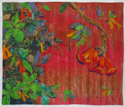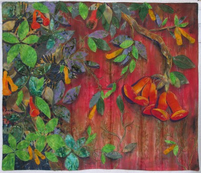 I presented my problem to the critique group I belong to and with the exception of 2 people, the suggestions were not helpful and ranged from ” change the color” to ” add some beads and bling”. Neither of those were going to happen. What I did was add more foliage, darken the vines and tendrils with thread and shade the background so the foliage advances in the composition. Here are the before and after shots. You be the judge if I should have left it alone.