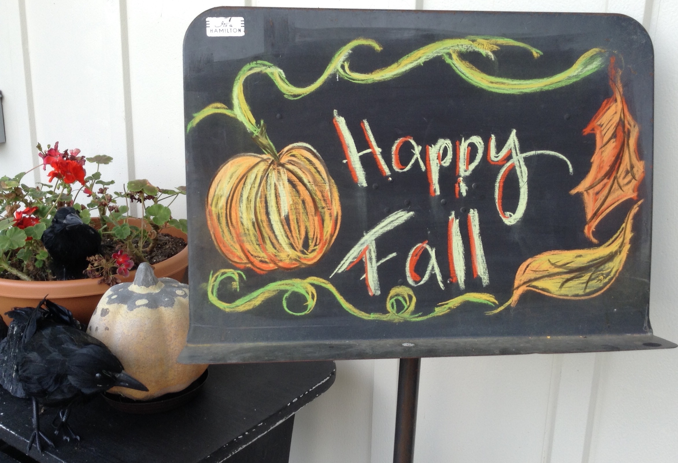 Antique Hamilton music stand from a garage sale last month. $1.00 bargain. Painted with homemade chalkboard paint to change messages with the seasons. Sad little geraniums will be replaced with mums and flowering kale when the garden center gets stock. I love finding alternate uses for other people’s junk.