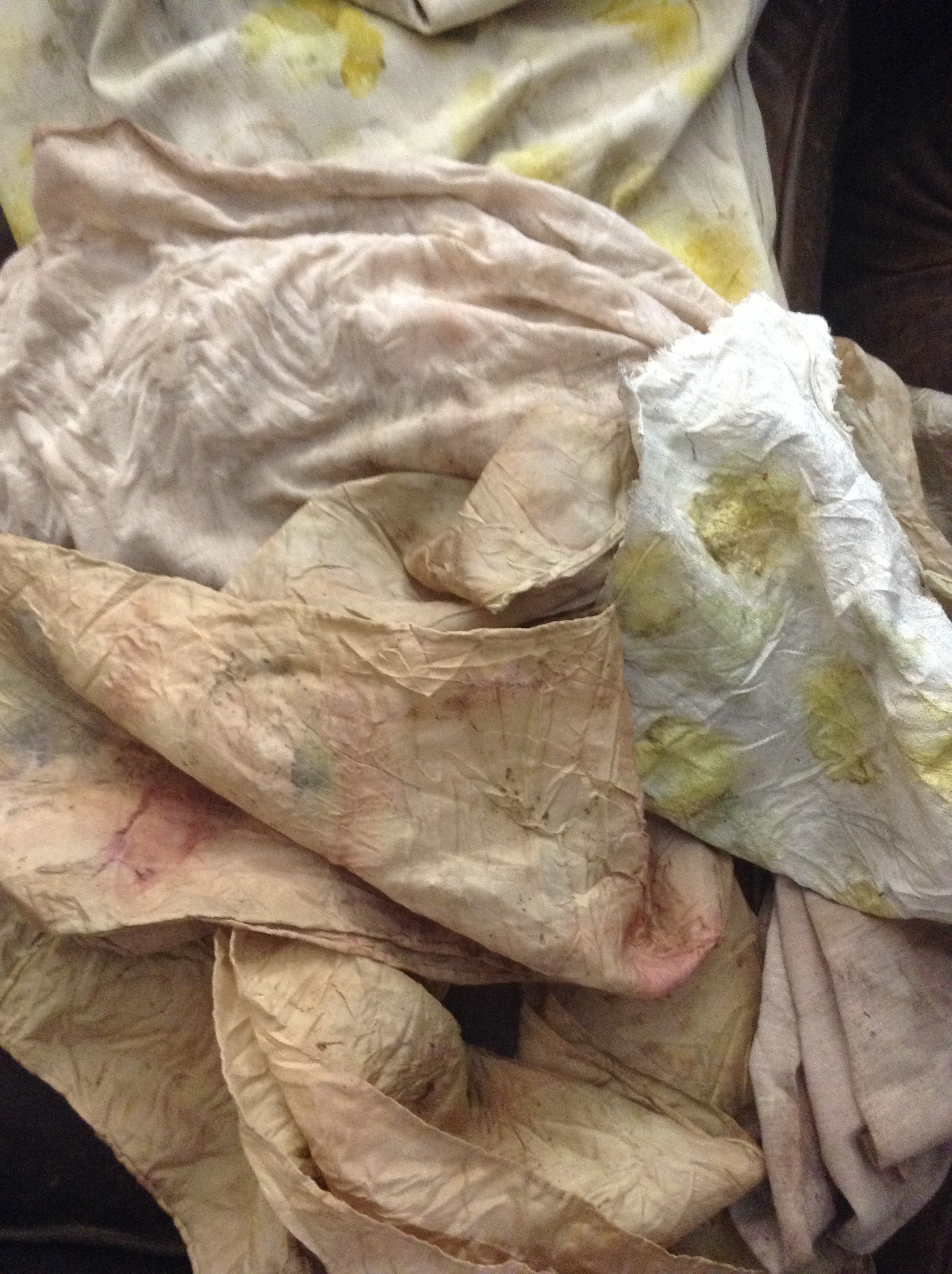 Just enjoy it Janis. I have a water softener and your water will change everything! The shawl is a do-over so no additional mordant after the initial alum and iron. The marigolds added nice drops of color. The silk scarves don’t have a mordant and the black locust pods were a surprise of color. Prints would have been nice, but i am always drawn to the natural marbling.