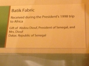 While visiting the Clinton Presidential library in Little Rock I was studying the textile gifts to the President and First Lady. My eyes popped out when I saw this case and fabric. I have that fabric in my African textile collection! How cool is this? Sorry the color is a bit off from photographing through the museum glass and lighting but the fabrics match!