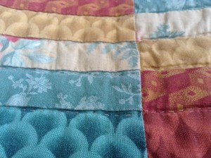 I did not know the rules of quilting either. Can’t you tell by the stitches right up to the seam lines? I had no frame or hoop so this was entirely stitched on my lap without a hoop. It actually turned out that a few years later I taught classes on quilting without a hoop.