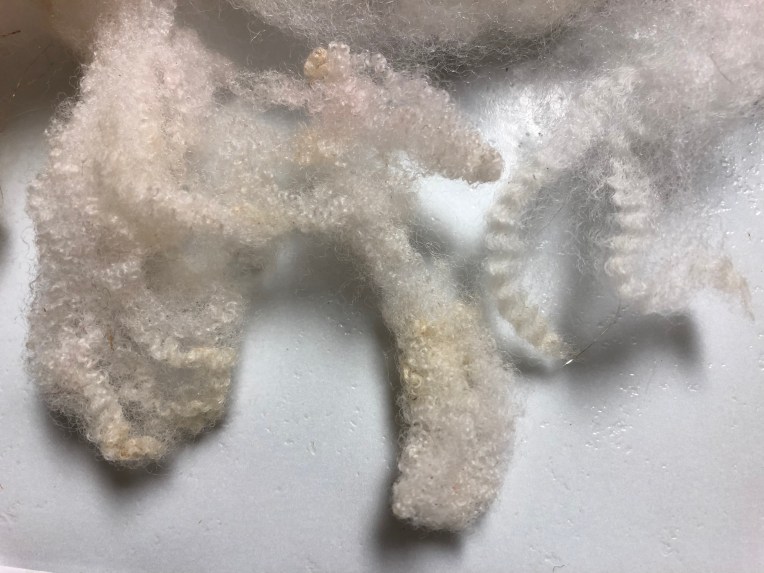 My first batch in the peroxide bowl did great. It whitened up to an off white color. I’m happy with that. The rest of the wool is being washed and then laid out to dry. I may try some hair lightening peroxide to see if I can get a brilliant white. Yeah yeah yeah…I know I can BUY white wool and white locks but what’s the fun in that? I will save some of the locks and curly bits to use for texture as is. The rest will be hand carded.