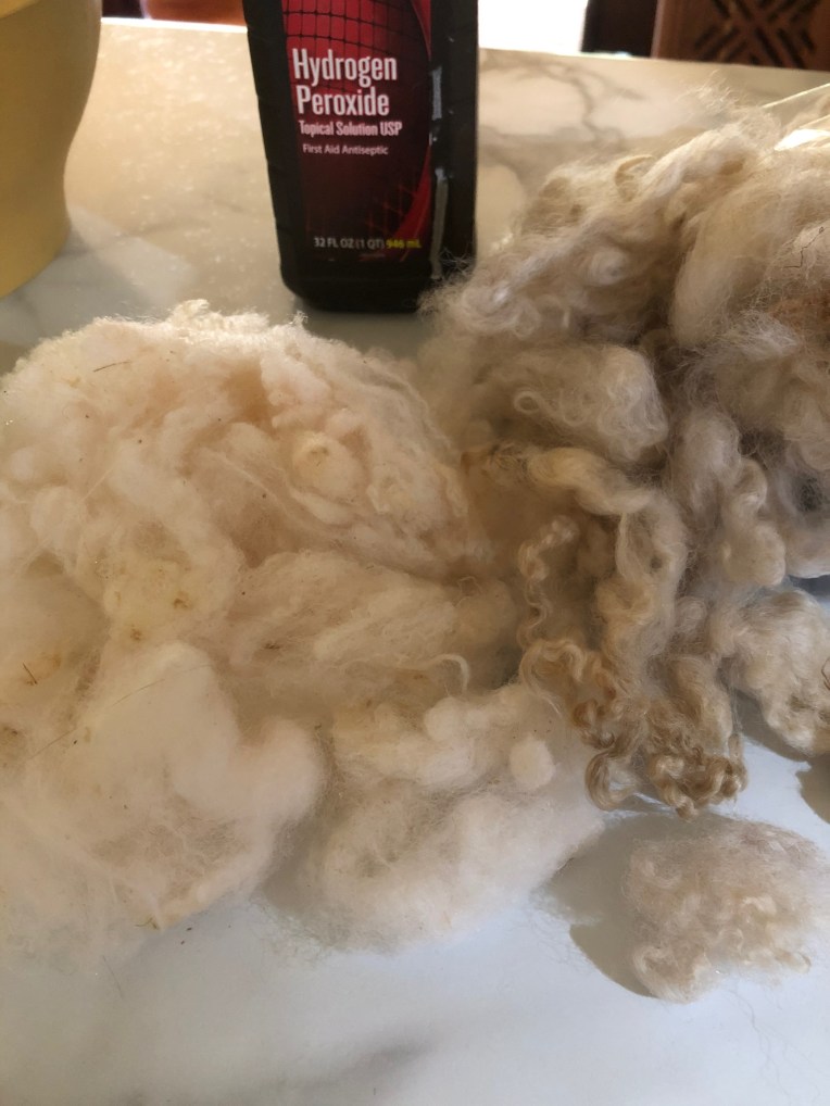Internet to the rescue again. I found an older blog with experiments whitening raw wool with hydrogen peroxide. Honestly, what did I have to lose?