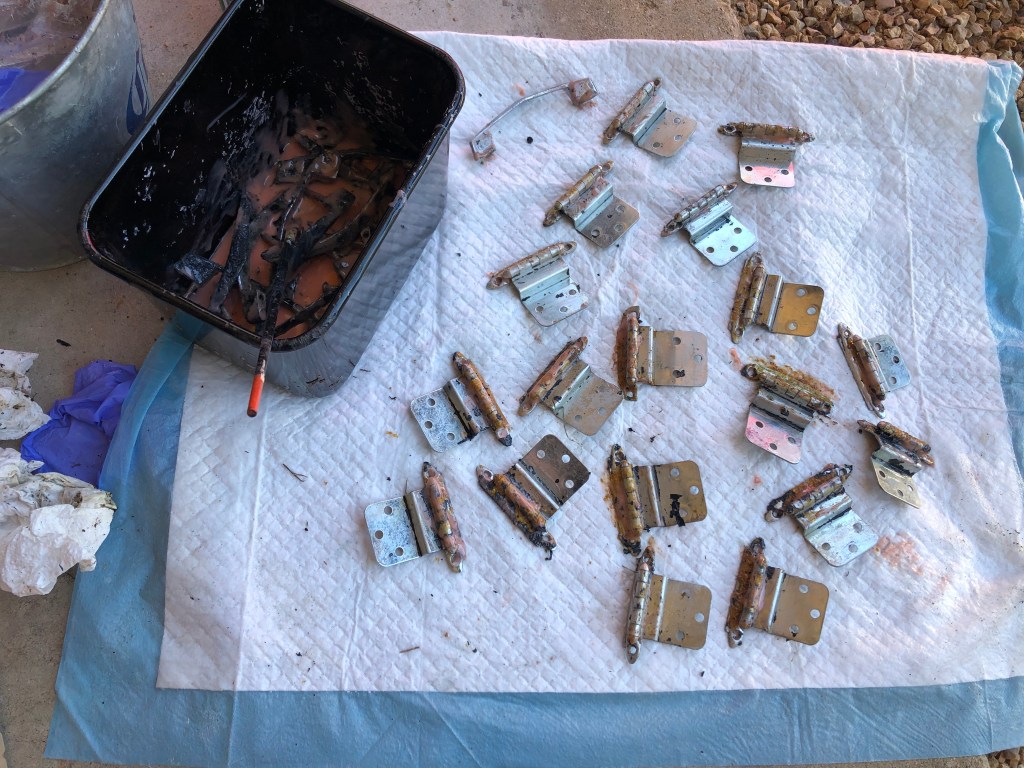 Bits by bit we get work done on Lolo the 1959 Shasta Airflyte. She had no original light or step assist so we went shopping. ( Yay! Shopping is one of the best things about restoration projects.) Love the LED porch light we found and the step assist is a stainless handicap grab bar. I think they look good! Ron got the DOT exterior marker lights on and working while I worked on stripping the nasty black paint off all the original cabinet hardware. It’s an icky job but this CitriStrip at least smells like oranges. I plan on stripping the black paint off her wings and shining them up. I am also planning on adding a silver stripe in the black.