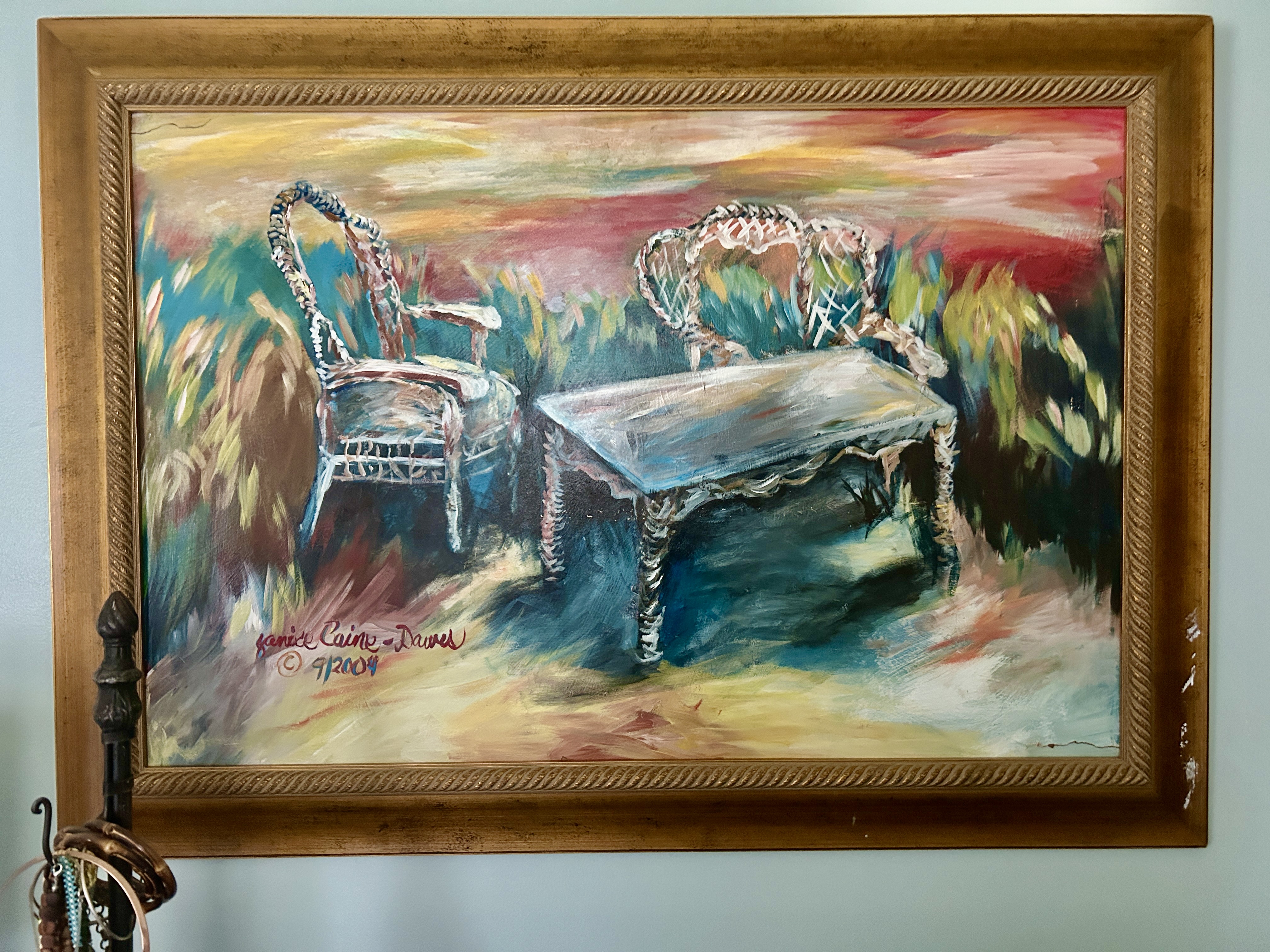 We just repainted the bedroom and needed something different above the dresser. This is the right size and the frame I found also has a little paint damaged area. Soooo, does a painting have to match the sofa or the room color? NO of course not. I told Ron this has so much emotion and is a perfect representation of us at this point in time. We are in the sunset of our years. Like these chairs, we have weathered the storms of life and still stand strong together even if we are a bit battered and worse for wear. It’s a perfect fit and we will enjoy waking up to this every dy.