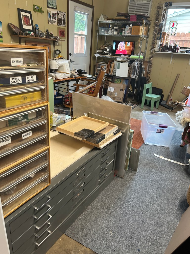 The massive Bernina quilting frame and mid-arm machine are gone from the space. It is in the process of being transformed into a painting studio. ( Yes, there will still be a small space for stitching but I am slowly divesting those materials. ) I had set up a painting studio and pastel table in the middle bedroom but it was way too small to get much done. I had stuff there and more stuff here and what I needed wasn’t readily at hand. That meant trudging to the other end of the house. Now, I needed the exercise but it really cut into my creative time since I would go through the living room and something else that needed done would grab my attention.