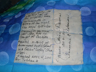 It seems they are never permanent enough and can be ripped off and lost. I decided to paint a square on the back of the quilt and add a little more of the story that goes along with it. I used India Ink for the text and put a coat of acrylic varnish over it. It should hold up under lots of washings.