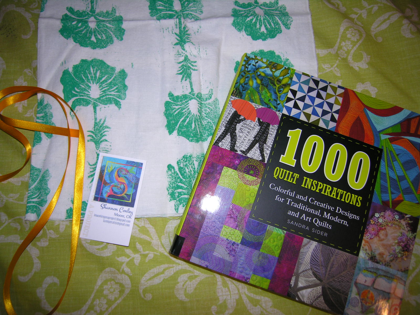 Not only did I get a copy of the book, but it was nicely packaged in a piece of hand stamped fabric and a piece of ribbon in my most favorite shade of yellow. I asked Shannon about the fabric and she said she had been in a fabric exchange with some other artist and this was a fabric she received. If you know who designed this and the stamps or screen that was used, I would love to know about it.