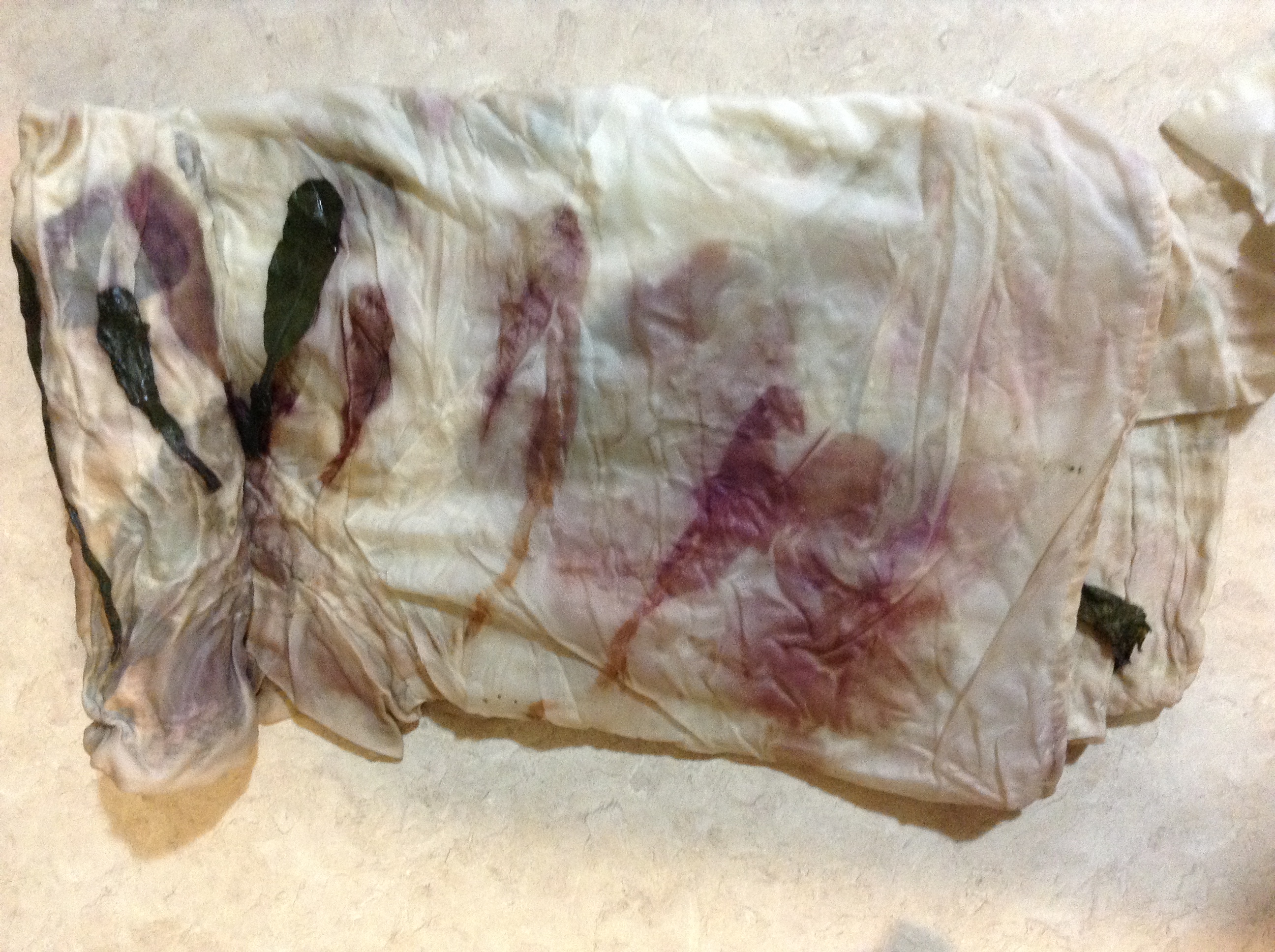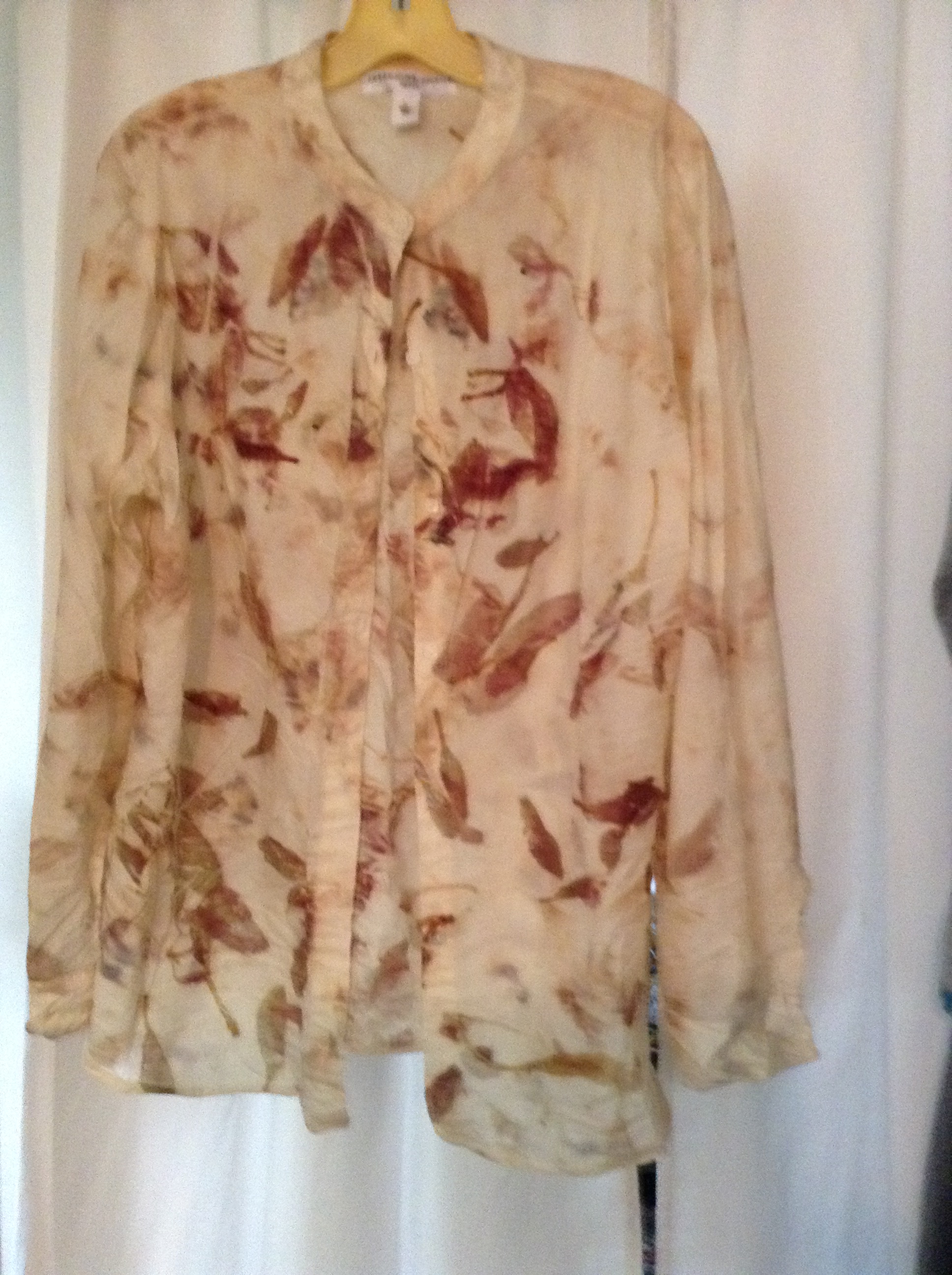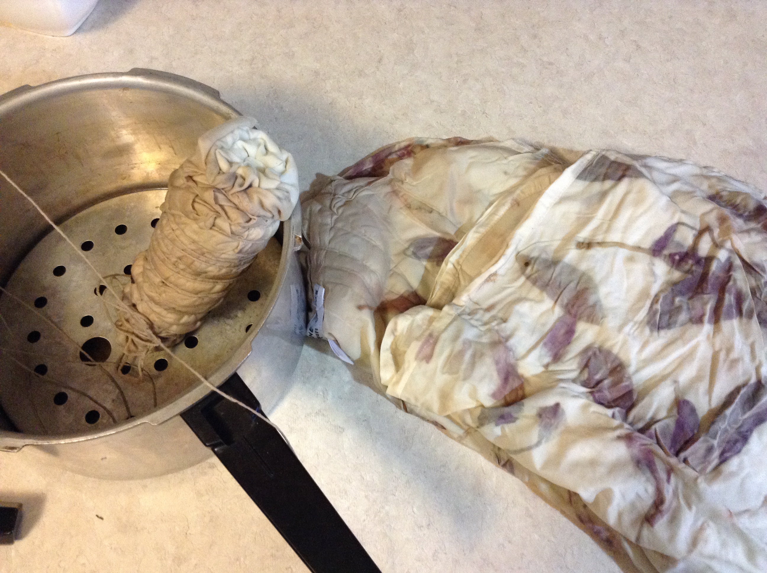 2 upcycled silk blouses were layered with frozen woad leaves, then processed in the pressure cooker. The strong dye (indigotin) penetrated all layers of the bundles leaving full and ghost prints. I love the depth created with the leaves this way. Be sure to right click for an enlarged image to see the detail.