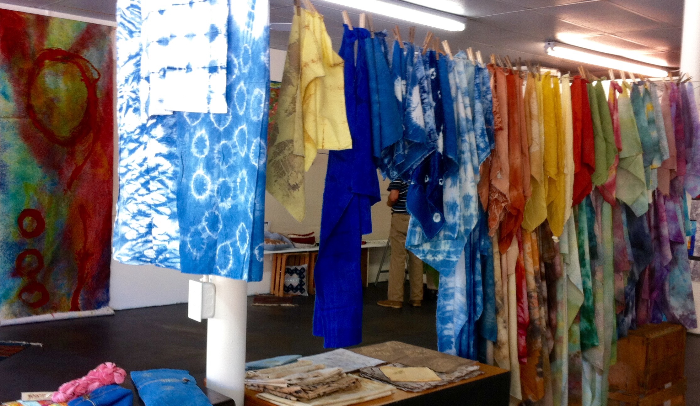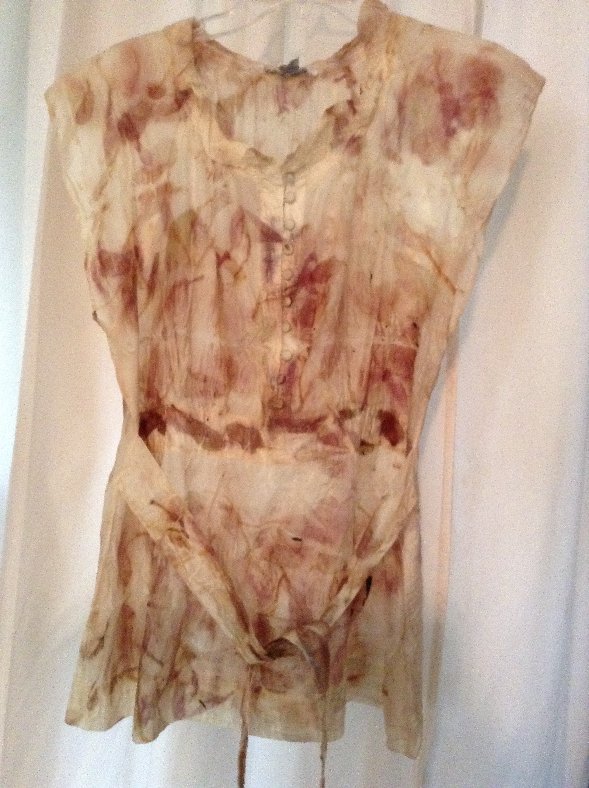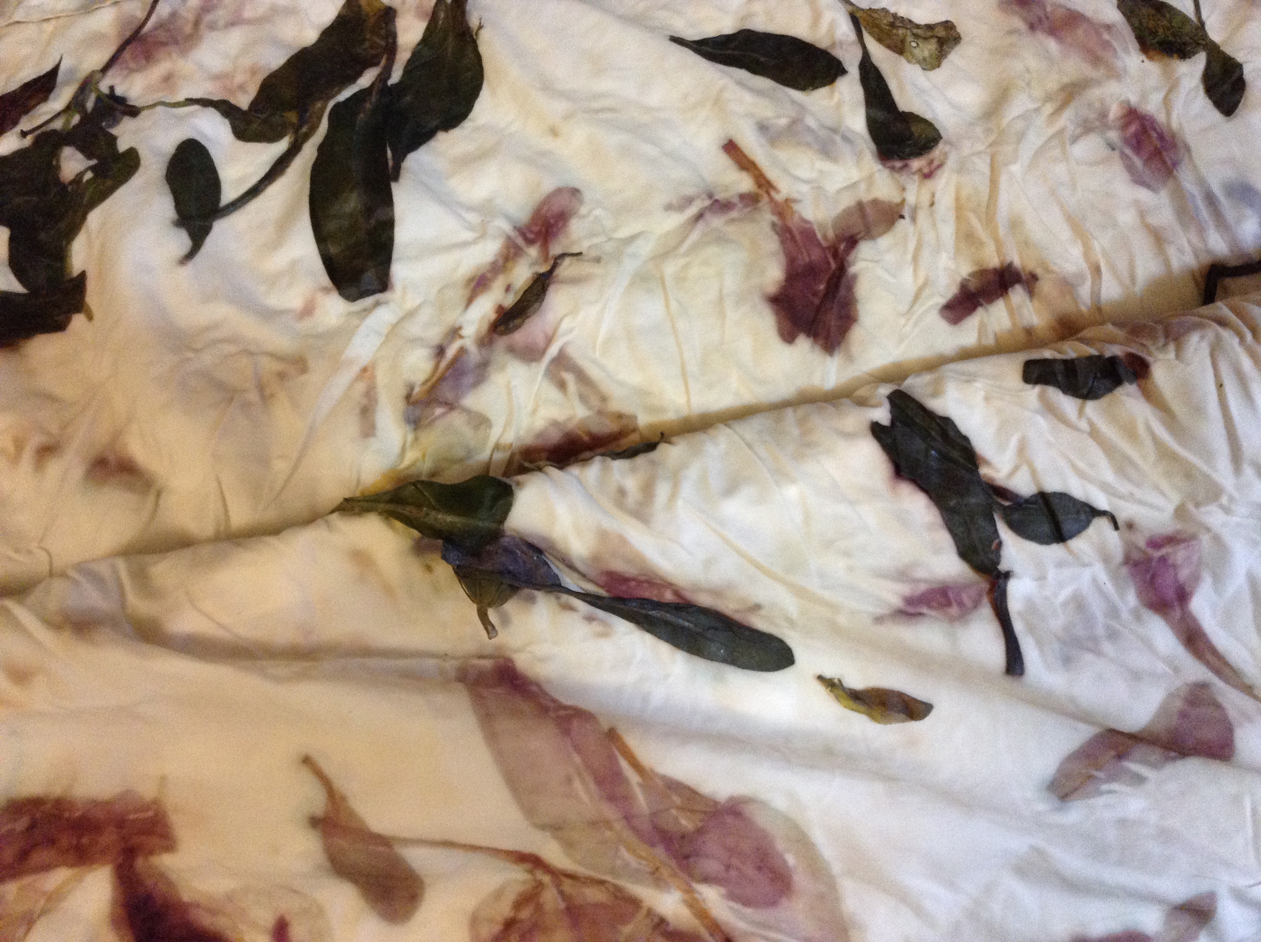 2 upcycled silk blouses were layered with frozen woad leaves, then processed in the pressure cooker. The strong dye (indigotin) penetrated all layers of the bundles leaving full and ghost prints. I love the depth created with the leaves this way. Be sure to right click for an enlarged image to see the detail.