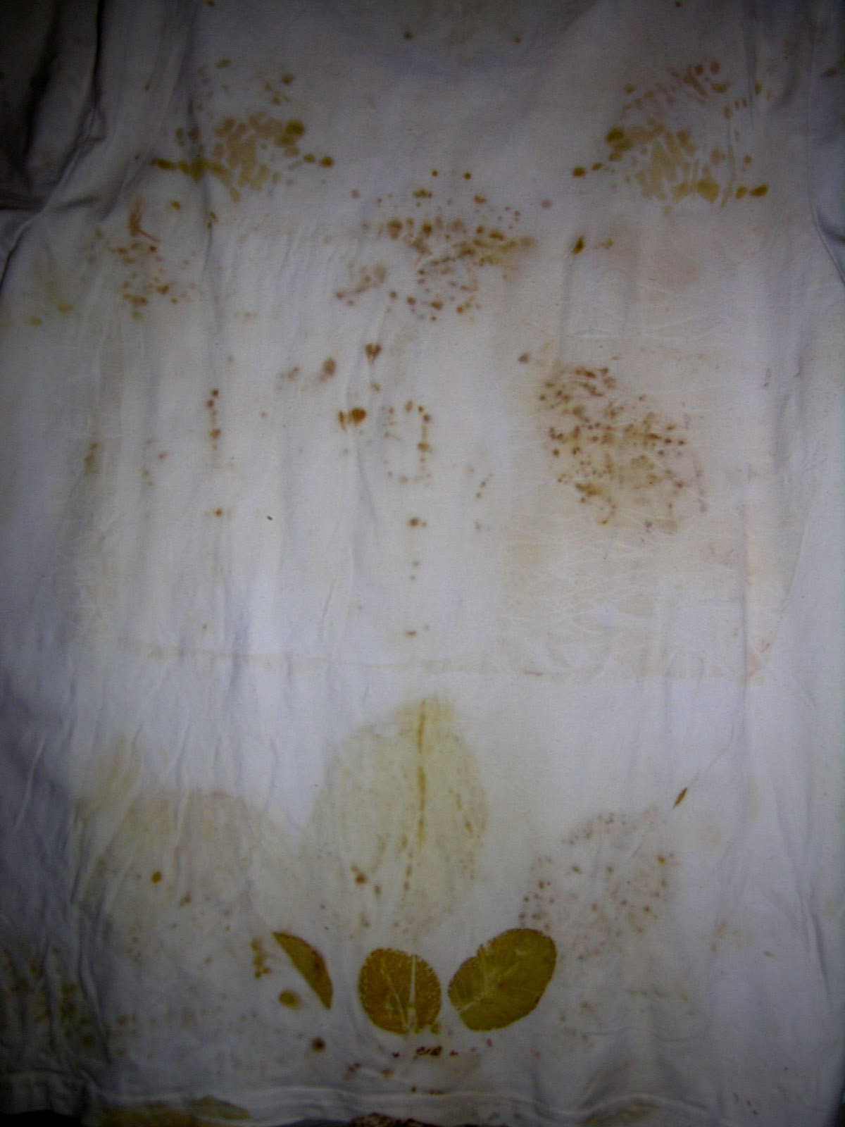 Ron and I have been printing scarves and such while we have good weather. I love this tee!  It is printed with dogwood, smoke bush and fern fronds.  A funny thing is happening with our prints. We weren’t thrilled with the results at first, pale and lack-luster. So I took a page from some literature on persimmon dyeing and plunged this in baking soda water. I got this amazing gold color.  Who knew!